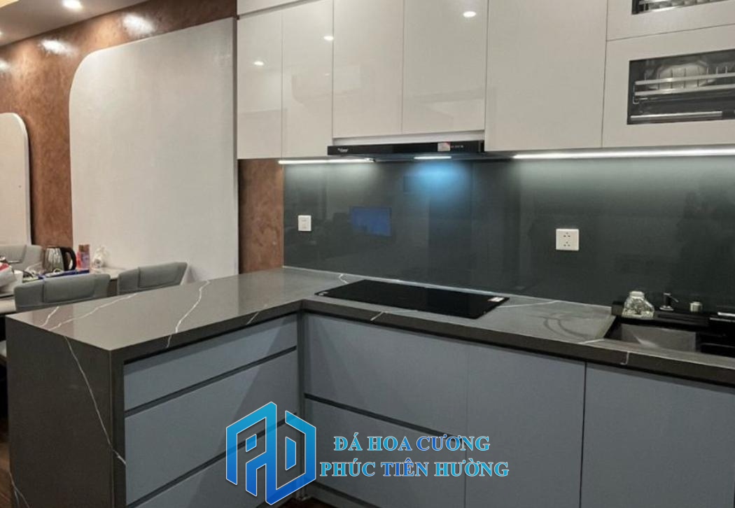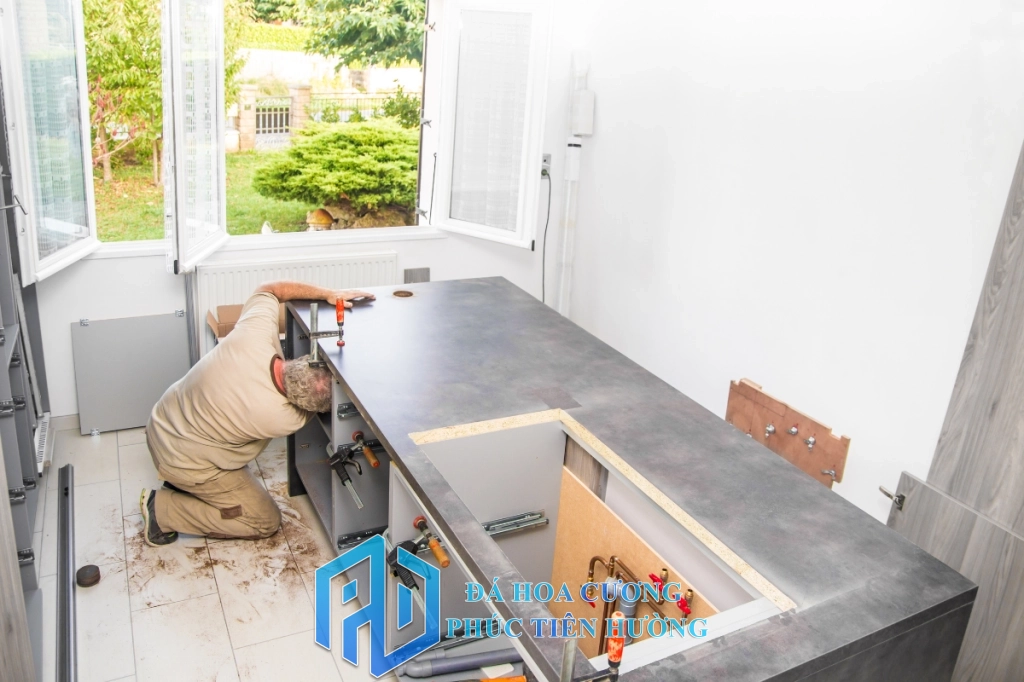Đội thợ thi công đá bếp có kinh nghiệm nhiều năm, làm việc cẩn thận. Đảm bảo mặt đá phẳng, keo dán chắc chắn, các mối nối kín và đẹp.