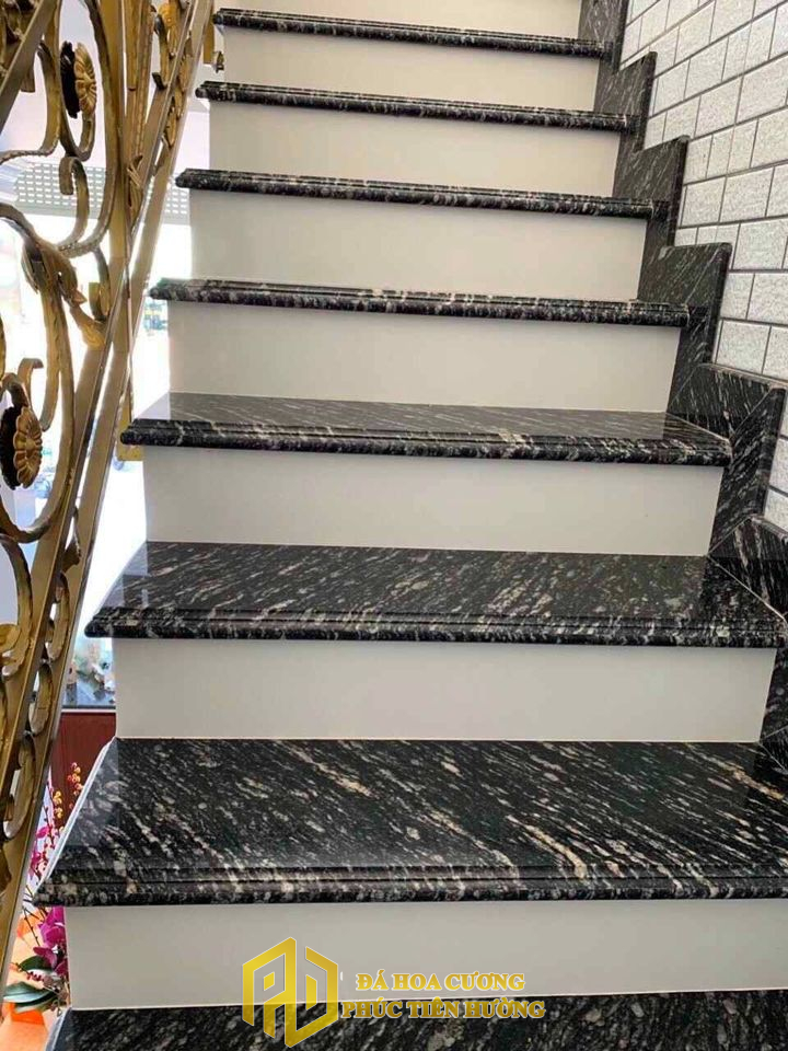 Cổ bậc và chiếu nghỉ được thi công đồng bộ để tạo sự liền mạch. Có thể phối màu tương phản hoặc lựa chọn đá vân nổi bật để tạo điểm nhấn.